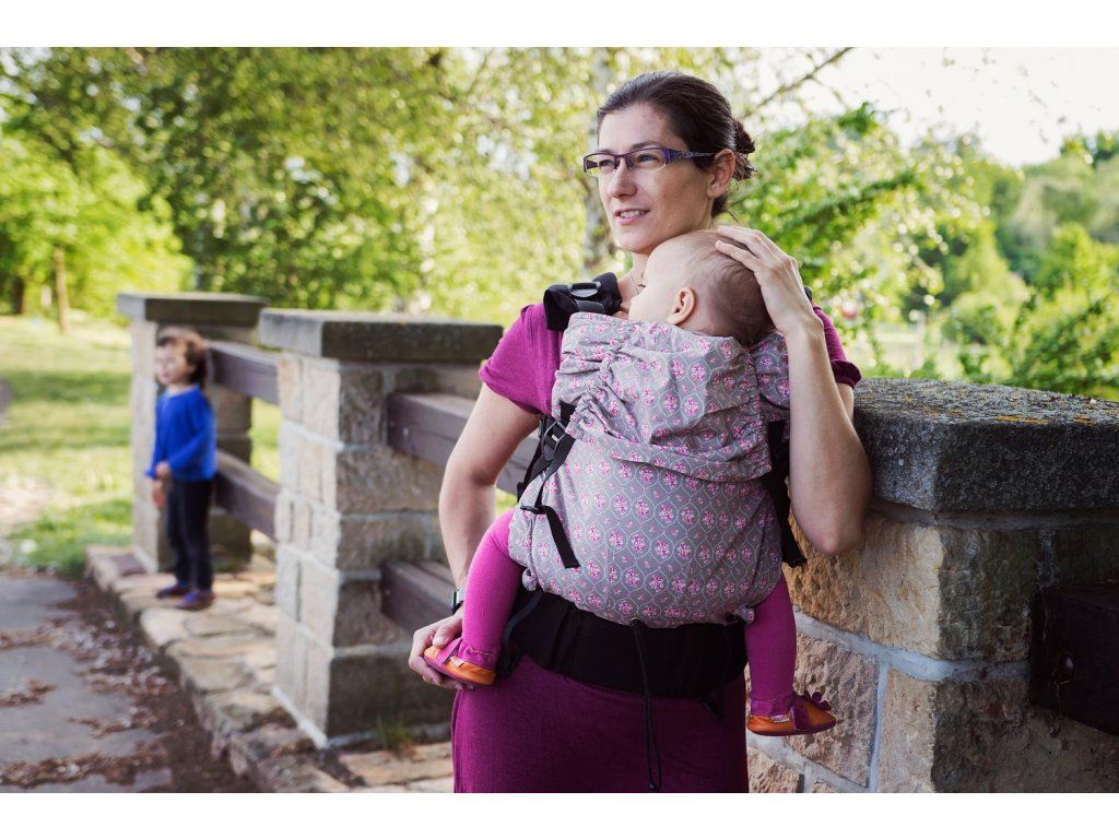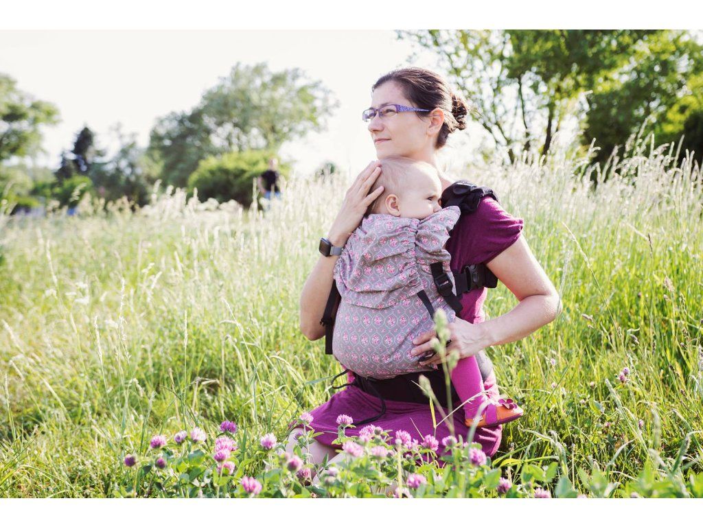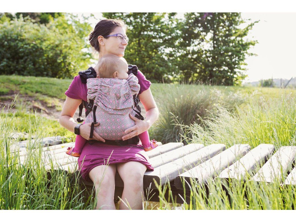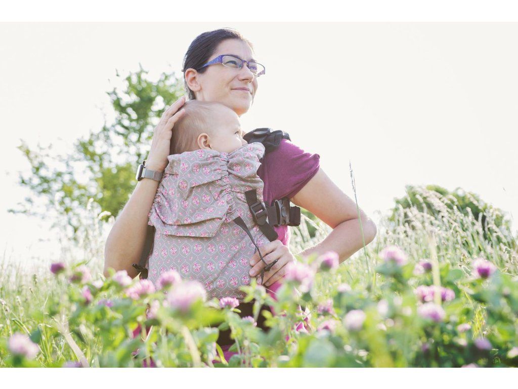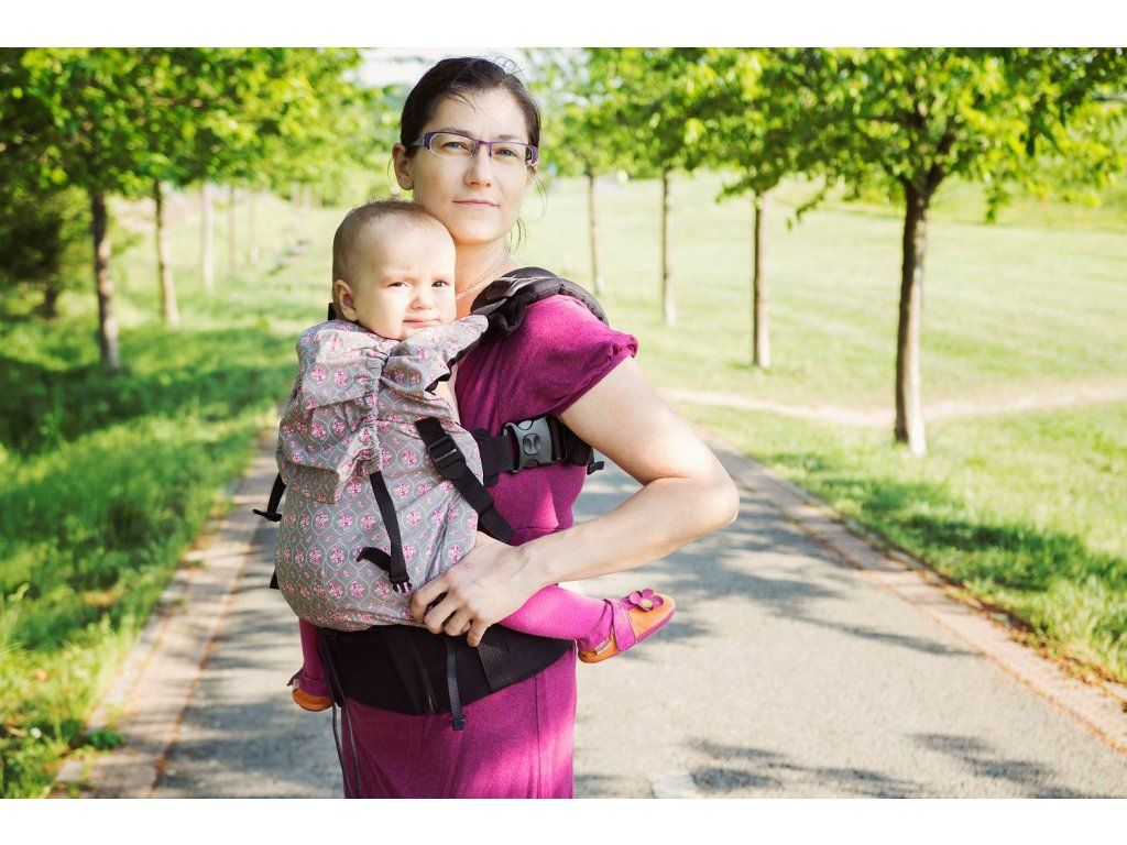 V horní části je zádová opěrka volně navlečená na ramenní popruhy - díky tomu ji lze plynule vytahovat výš nebo níž podle aktuální potřeby. Pokud miminko usne, vytáhnete mu opěrku jednoduše nad hlavu a tím ji zajistíte proti náhlému záklonu. Při nošení větších dětí na zádech je pak možné opěrku zajistit ve zvolené výšce pomocí všitých schovaných karabinek. Minimální výška zádové opěrky je cca 32 cm, maximální pak 52 cm.