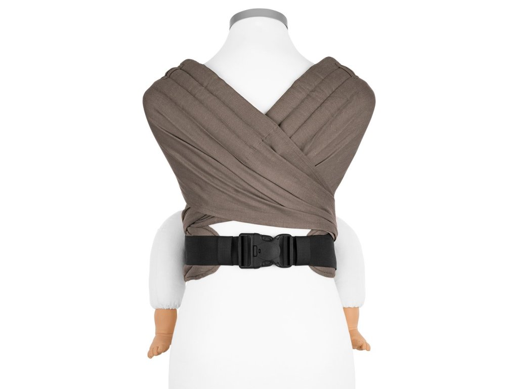 Měkký bederní pás tohoto nosítka se zapíná pomocí bezpečností přezky, která se velmi snadno dotahuje, a je vhodné od konfekční velikosti XS po XXL. Jeho ramenní popruhy jsou široké přibližně jako polovina šířky samotného šátku a do poloviny šíře měkce polstrované. Křížením popruhů přes zadeček dítěte můžete ještě zvýšit nosnost a pohodlnost při nošení těžších dětí.