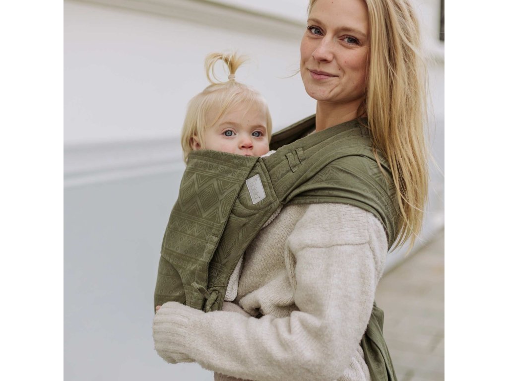 Měkký bederní pás tohoto nosítka se zapíná pomocí bezpečností přezky, která se velmi snadno dotahuje, a je vhodné od konfekční velikosti XS po XXL. Jeho ramenní popruhy jsou široké přibližně jako polovina šířky samotného šátku a do poloviny šíře měkce polstrované. Křížením popruhů přes zadeček dítěte můžete ještě zvýšit nosnost a pohodlnost při nošení těžších dětí.