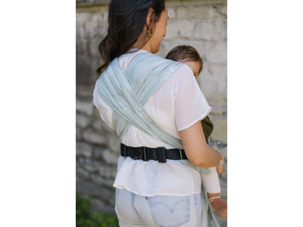 Měkký bederní pás tohoto nosítka se zapíná pomocí bezpečností přezky, která se velmi snadno dotahuje, a je vhodné od konfekční velikosti XS po XXL. Jeho ramenní popruhy jsou široké přibližně jako polovina šířky samotného šátku a do poloviny šíře měkce polstrované. Křížením popruhů přes zadeček dítěte můžete ještě zvýšit nosnost a pohodlnost při nošení těžších dětí.