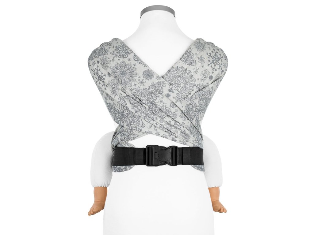 Měkký bederní pás tohoto nosítka se zapíná pomocí bezpečností přezky, která se velmi snadno dotahuje, a je vhodné od konfekční velikosti XS po XXL. Jeho ramenní popruhy jsou široké přibližně jako polovina šířky samotného šátku a do poloviny šíře měkce polstrované. Křížením popruhů přes zadeček dítěte můžete ještě zvýšit nosnost a pohodlnost při nošení těžších dětí.