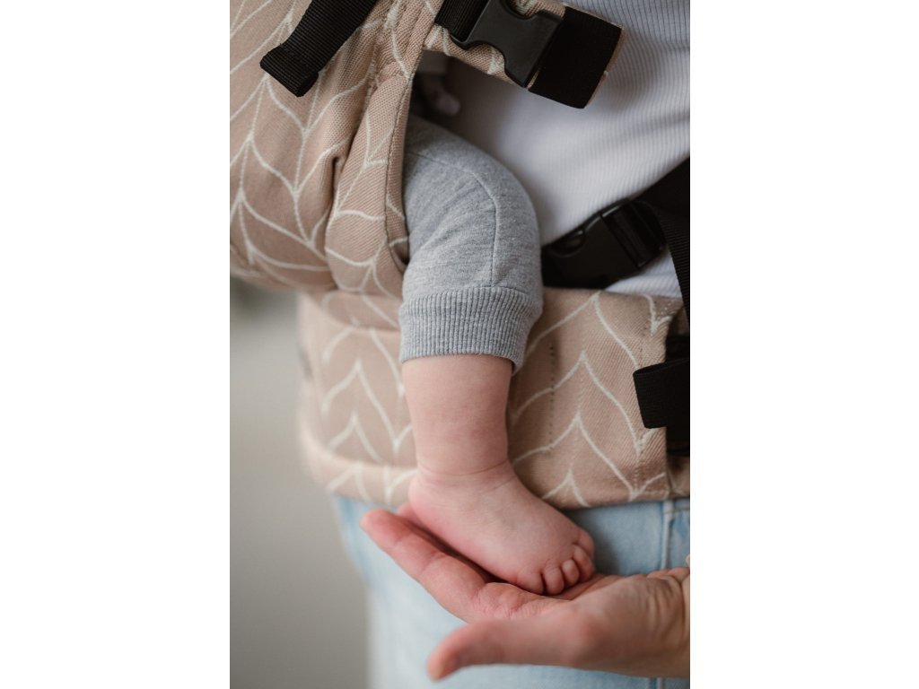 Nosítko disponuje ergonomicky tvarovaným, středně tvrdým bederním pásem, který si s přehledem poradí i s těžšími dětmi. Pro malé děti jsou na bederním pásu, v dolní části zádové opěrky, umístěné speciální přezky, díky nimž docílíte lepšího zakulacení a podsazení Vašeho miminka. Na zapínání bederního pásu nechybí jistící gumička proti samovolnému rozepnutí.
