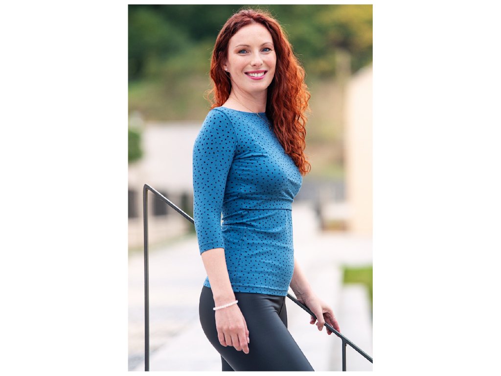 Krásné a praktické tričko modalového (bukové dřevo) + bio bavlněného úpletu se 3/4 rukávem a dvojitým předním dílem je hebké, prodyšné a nenáročné na údržbu. Ale především se v něm budete cítit opravdu skvěle, a to v období těhotenství, kojení, ale i po něm.