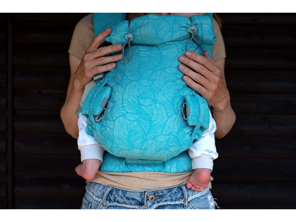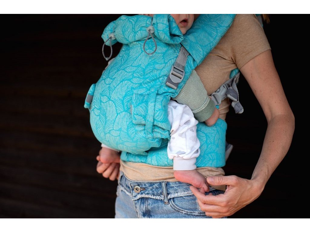 Kapuce nosítka nabízí několik důležitých funkcí. Její velikost lze plynule přizpůsobit. Po jejím shrnutí ke krku dítěte, provléknutí pásků pod speciálními šátkovými očky na ramenních popruzích a připnutí na malou přezku, docílíte zajištění hlavičky dítěte podle momentální potřeby.