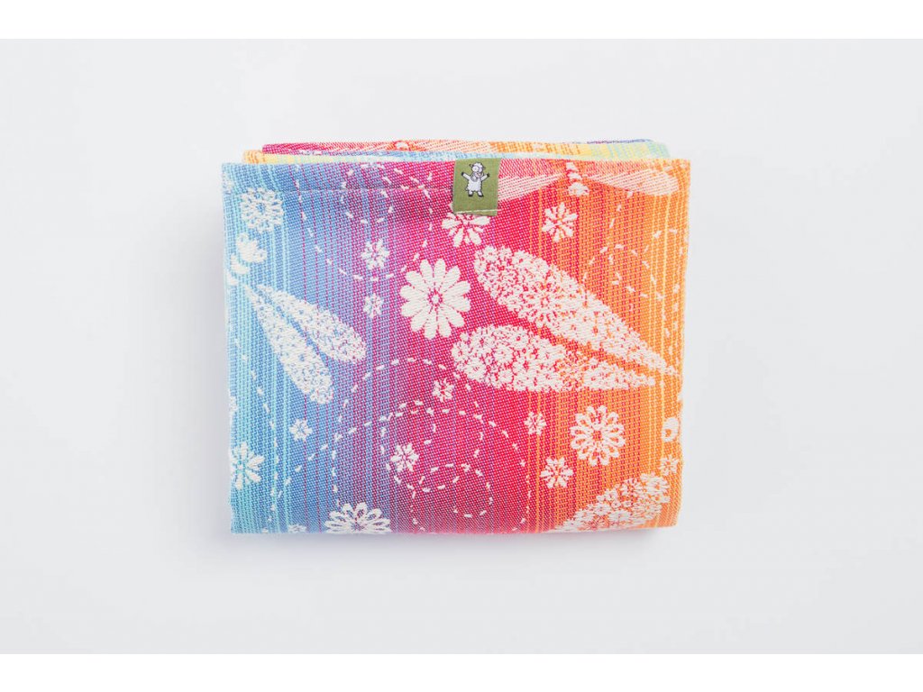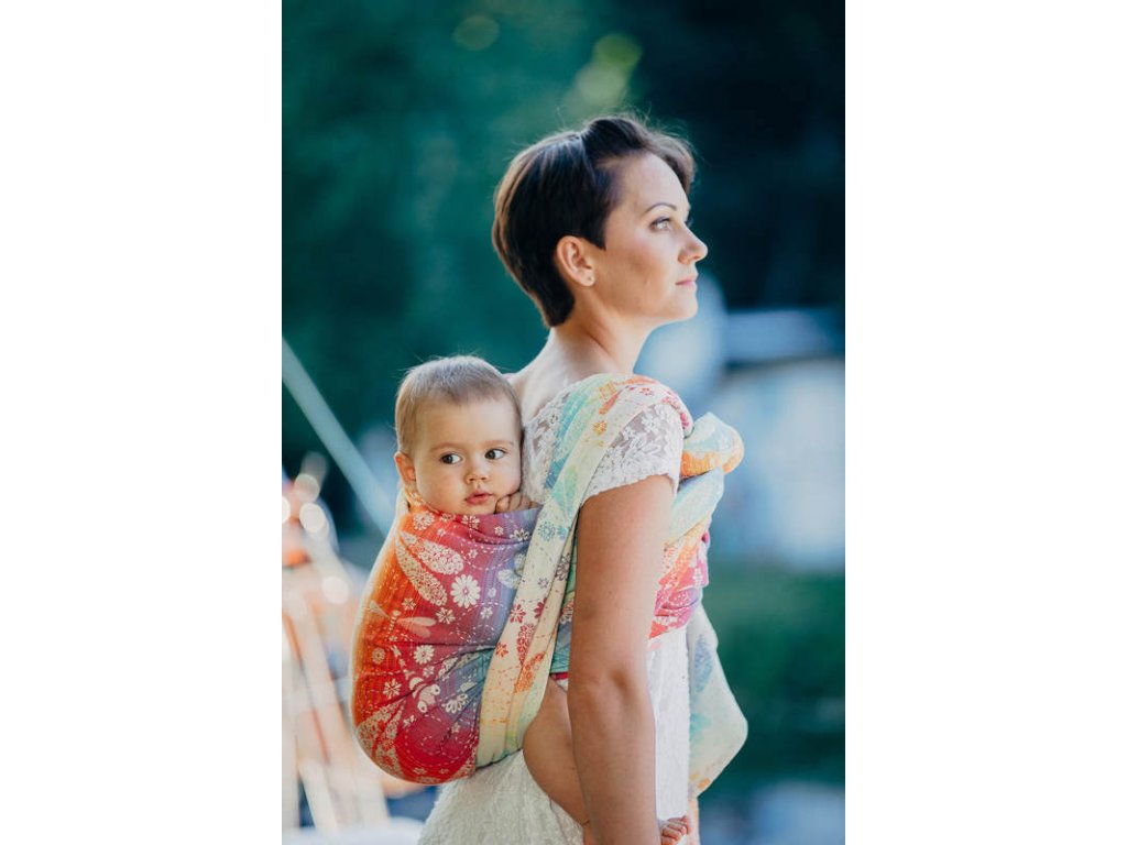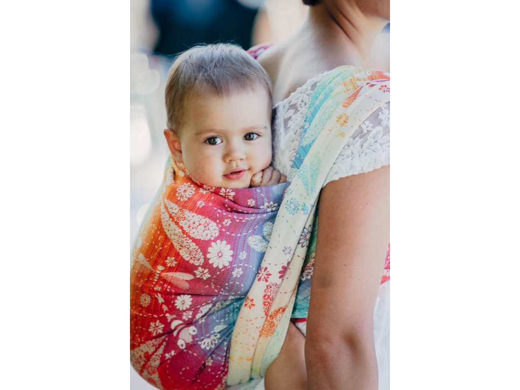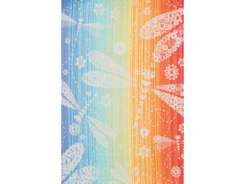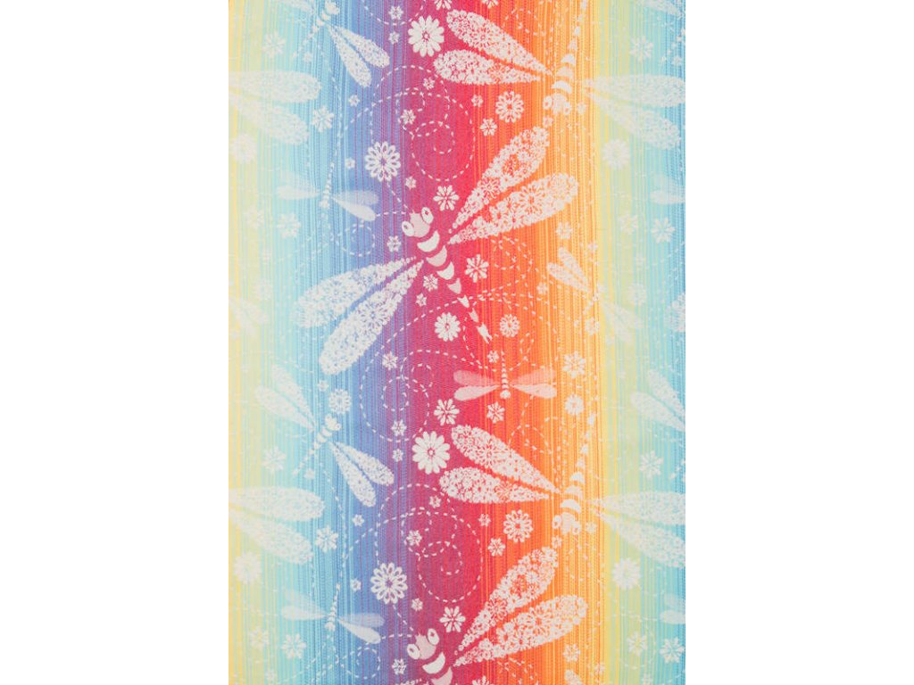 LennyLamb Dragonfly Rainbow je středně tenký celobavlněný šátek, který je určen pro nošení dětí zhruba od 4 měsíců, snadno si poradí s dvouletým nošencem ve vícevrstveném úvazu, proto se dá šátek zařadit do kategorie na celé nosící období.