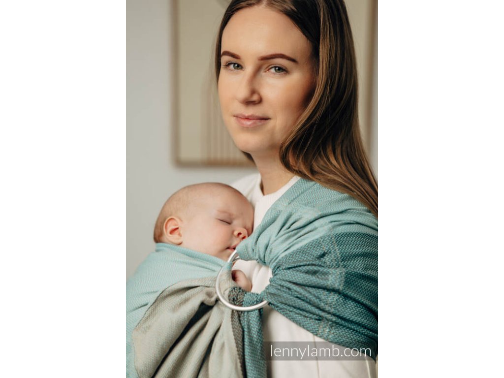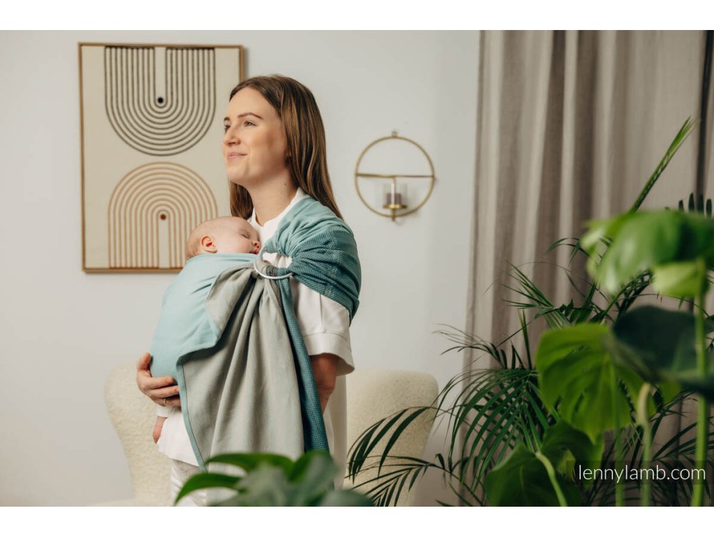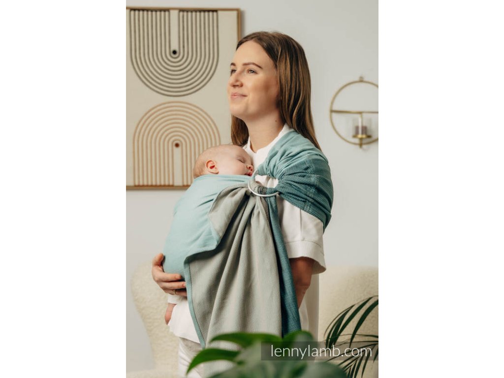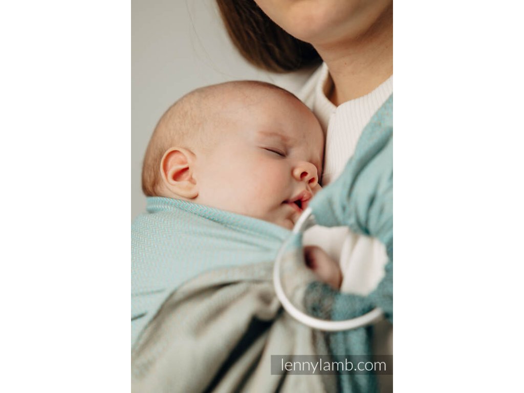 LennyLamb Ring Sling Little Herringbone Baby Mint je velmi tenký celobavlněný šátek, tkaný žakárovou vazbou. Díky své tloušťce je vhodný pro novorozená miminka i s nižší porodní vahou pod 3kg.
