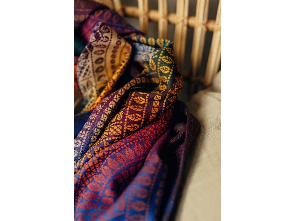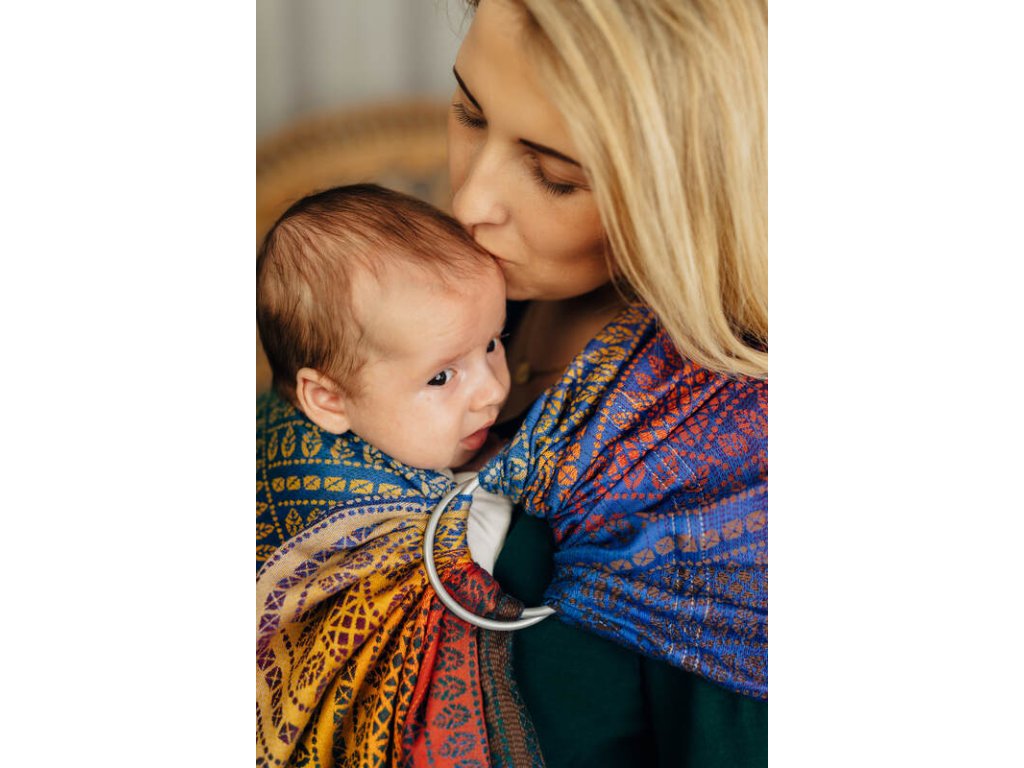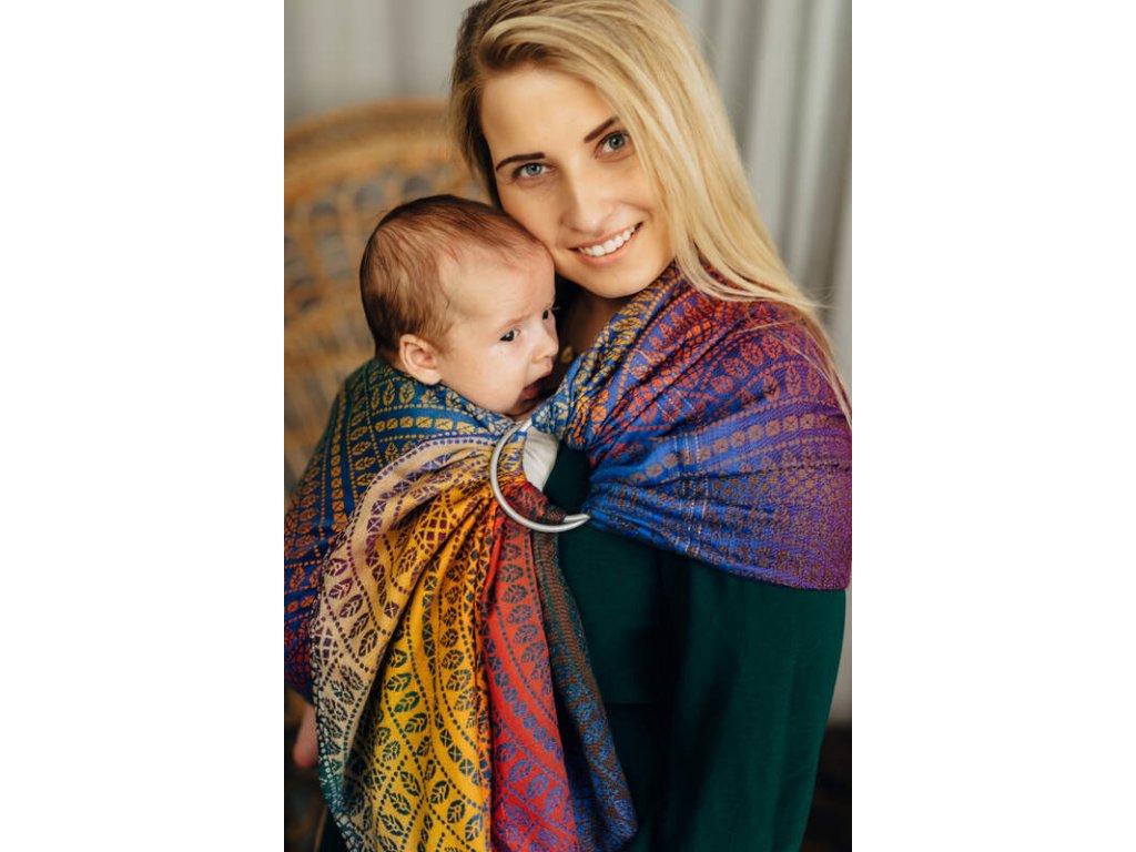 LennyLamb Ring Sling Peacock's Tail Bolero je středně tlustý celobavlněný šátek, který je určen pro nošení batolat a velkých dětí zhruba od 5-6 měsíců, snadno si poradí s tříletým nošencem, proto se dá šátek zařadit do kategorie na celé nosící období.