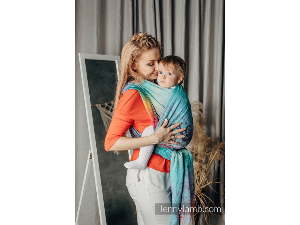 LennyLamb Symphony Daydream je středně tlustý celobavlněný šátek, který je určen pro nošení batolat a velkých dětí zhruba od půl roku, snadno si poradí s tříletým nošencem ve vícevrstveném úvazu, proto se dá šátek zařadit do kategorie na celé nosící období.