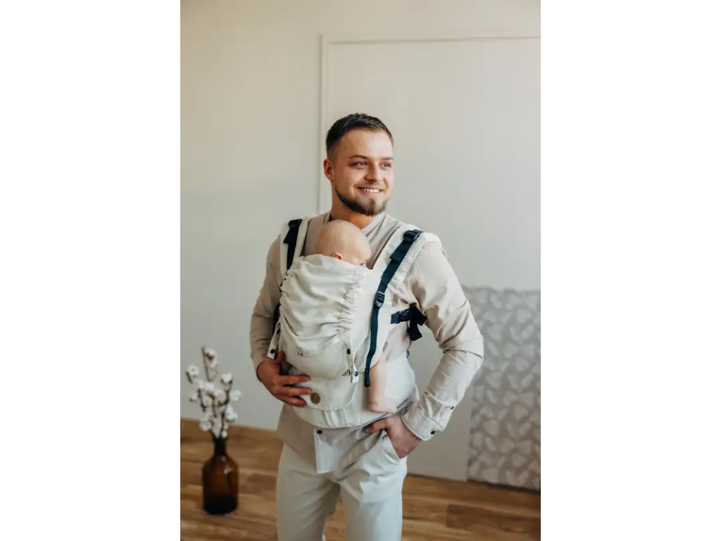 Šířka zádové opěrky se reguluje pomocí stahování suchých zipů po bederním páse, který je zevnitř označený velikostí miminka pro snadnější orientaci. Pro pohodlnější nošení se stahování bederního pásu skládá, což je velmi ohleduplné k vašemu bříšku.