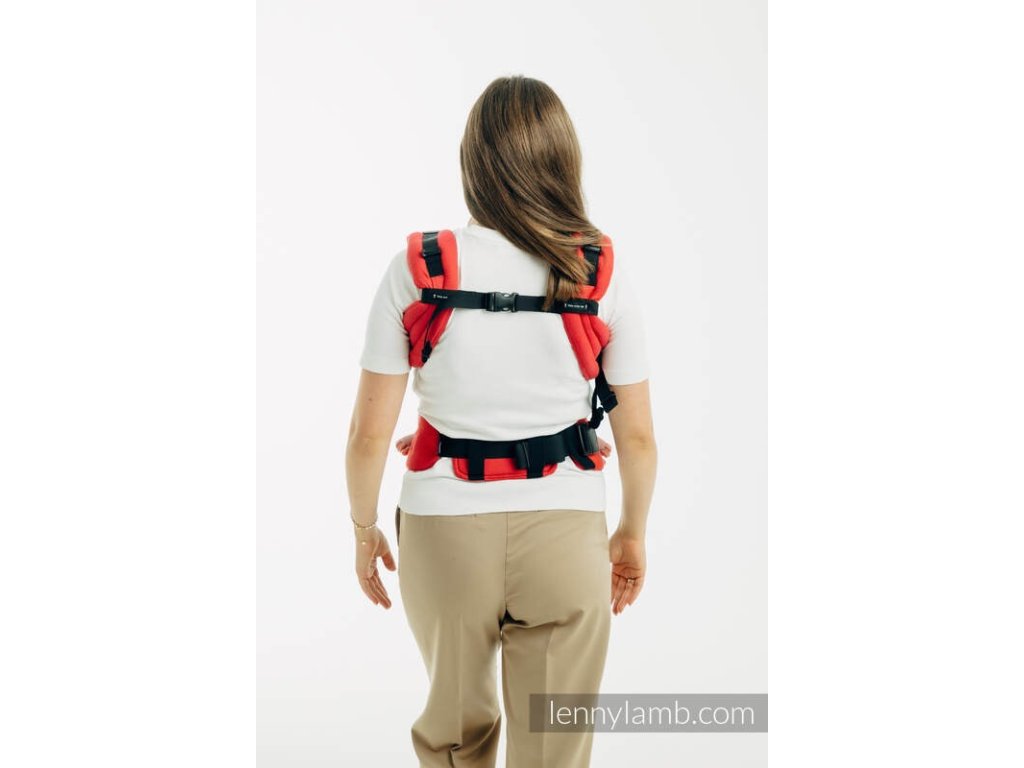 Výšku zádové opěrky lze plynule nastavit pomocí systému přezek na bočních stranách nosítka.