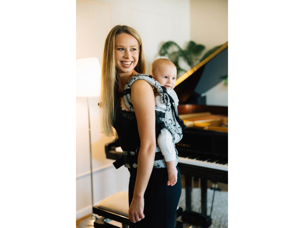 Šířka zádové opěrky se reguluje pomocí stahování suchých zipů po bederním páse, který je zevnitř označený velikostí miminka pro snadnější orientaci. Pro pohodlnější nošení se stahování bederního pásu skládá, což je velmi ohleduplné k vašemu bříšku.