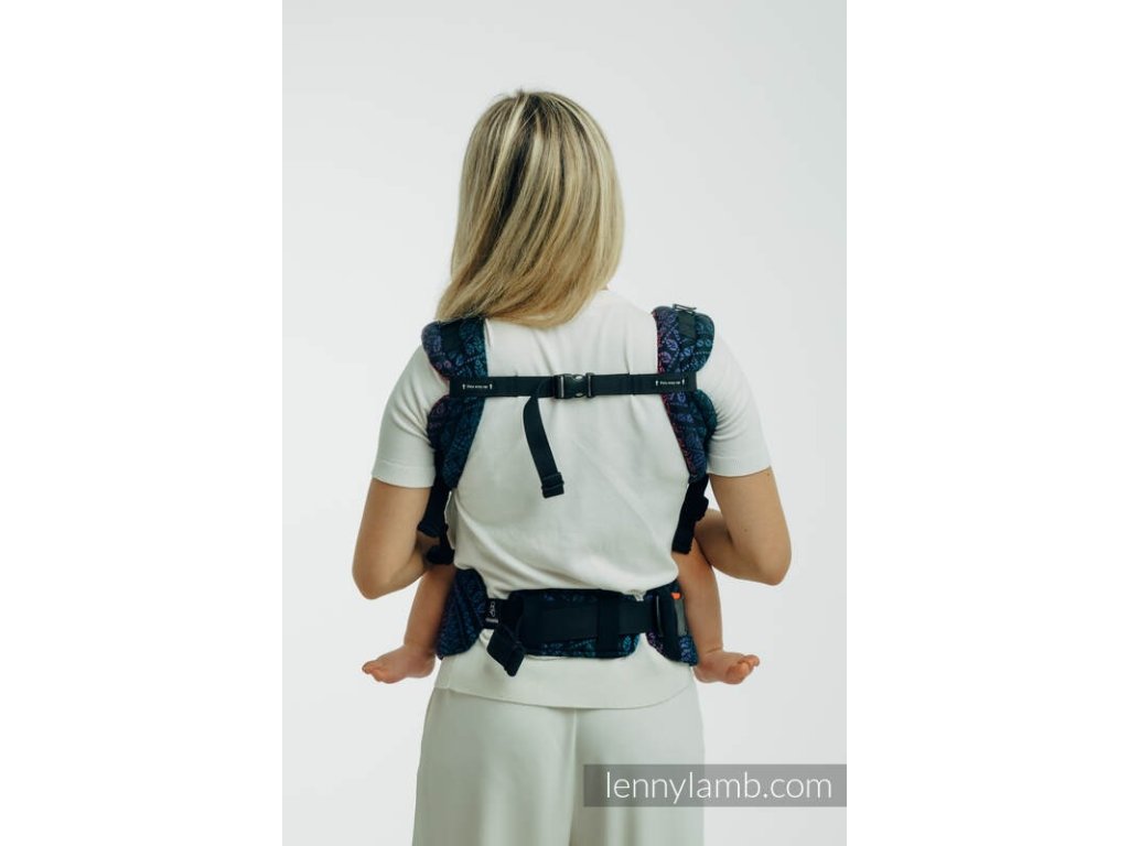 Mezilopatková (hrudní) spona je na klasickou přezku. Nově ji lze posunovat po celé délce ramenních popruhů nebo ji zcela sundat, pokud chcete nosítko nosit zapnuté do kříže. Pokud pregerujete magnetickou hrudní sponu, můžete ji dokoupit zde: https://www.isatky.cz/zbozi/lennylamb-magneticka-spona/ snadno ji vyměníte.