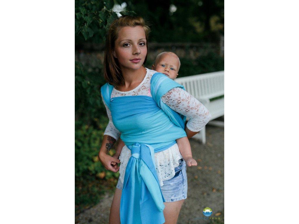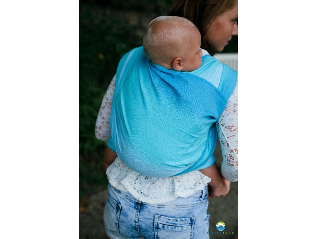 Little Frog je spíše tenčí šátek, tkaný lomenou keprovou vazbou, příjemně nosný, poddajný a měkký. Gramáž šátku zaručuje příjemný uzel v úvazu a nosnost i pro těžší děti ve vrstvených úvazech.