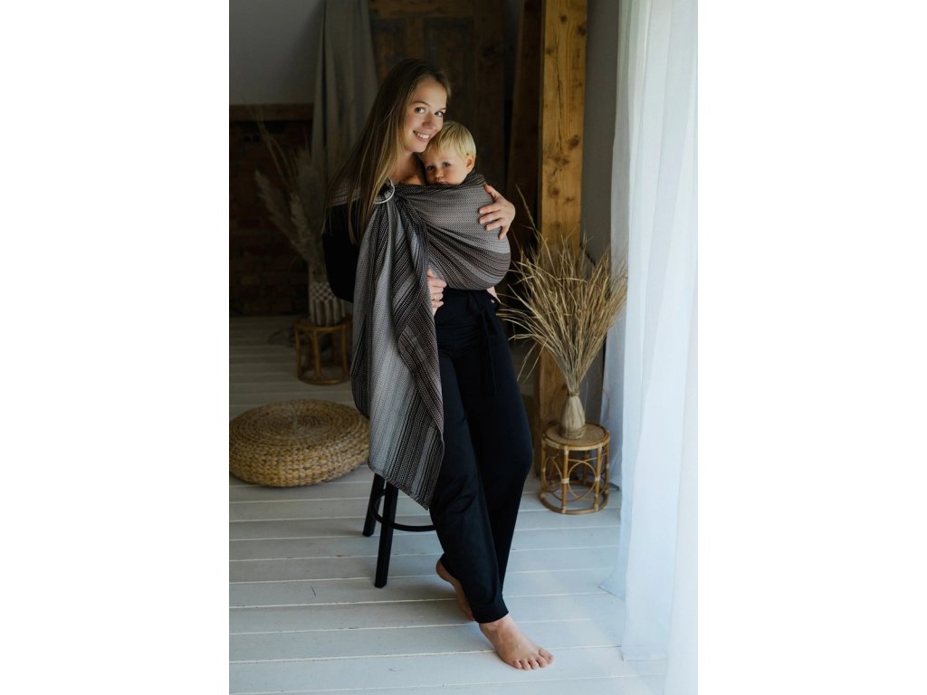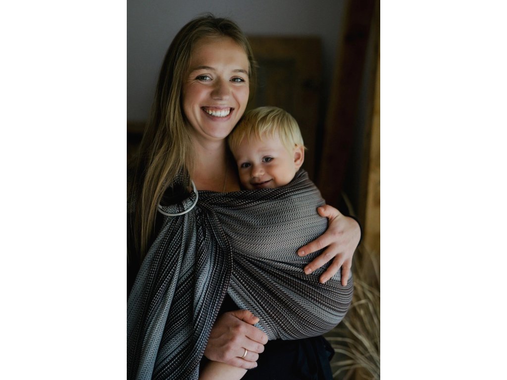 Šířka šátku 70cm. Tento Ring Sling je možné nosit na obou ramenou. Součástí jsou dva stříbrné hliníkové kroužky.