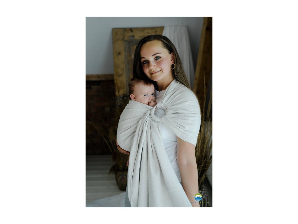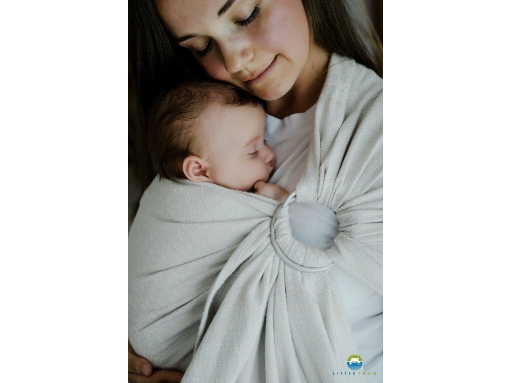 Little Frog Ring Sling Lovely Alabaster je středně tlustý šátek, tkaný žakárovou vazbou, je velmi nosný, poddajný a měkký, je určen pro nošení těch větších dětí a batolat zhruba od 4m do tří let.