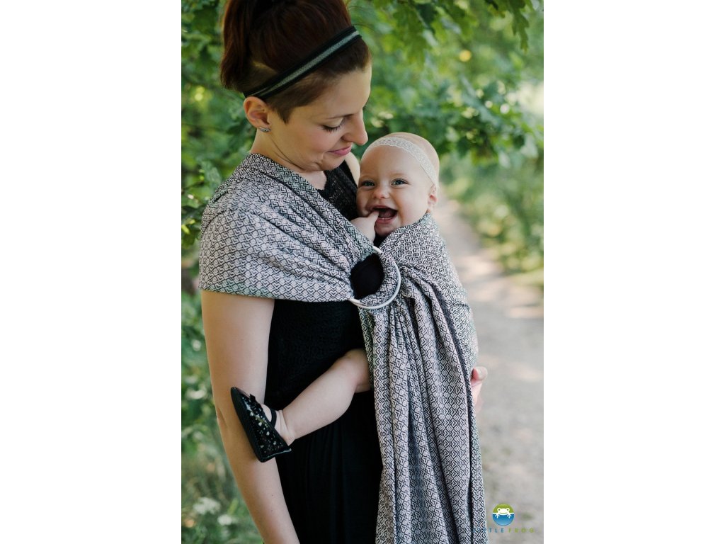 Little Frog Ring Sling Lovely Slate je je tlustší, celobavlněný šátek, tkaný žakárovou vazbou, který je určen pro nošení batolat a větších dětí zhruba od 4-6 měsíců a s přehledem zvlánei vašeho dvouleťáka.