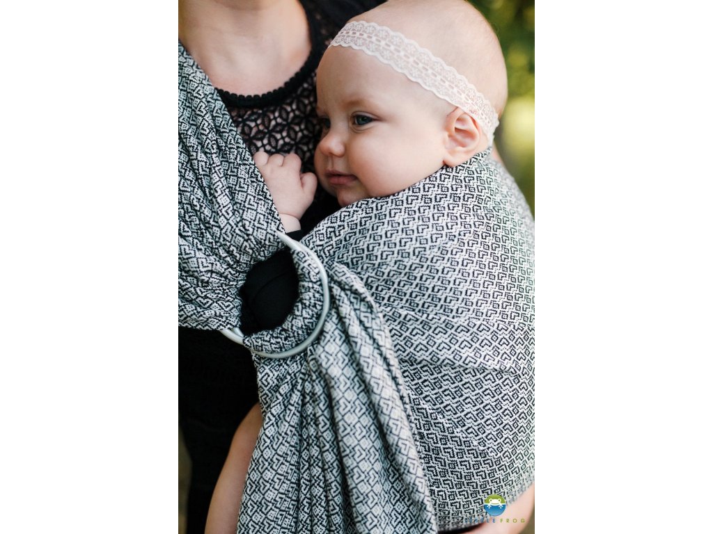Šířka šátku 70cm. Tento Ring Sling je možné nosit na obou ramenou. Součástí jsou dva stříbrné hliníkové kroužky.