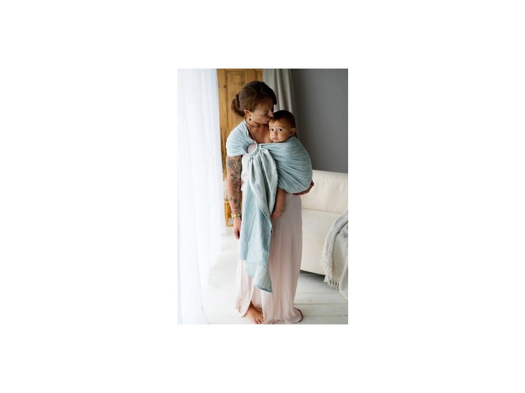 Šířka šátku 70cm. Tento Ring Sling je možné nosit na obou ramenou. Součástí jsou dva stříbrné hliníkové kroužky.