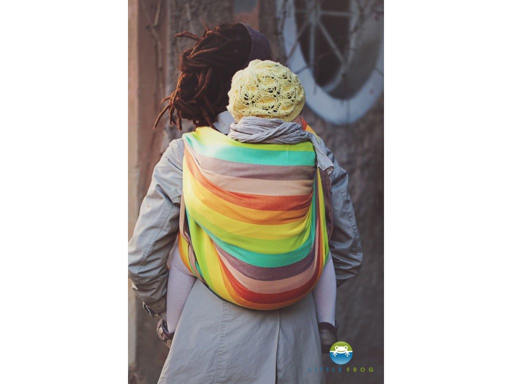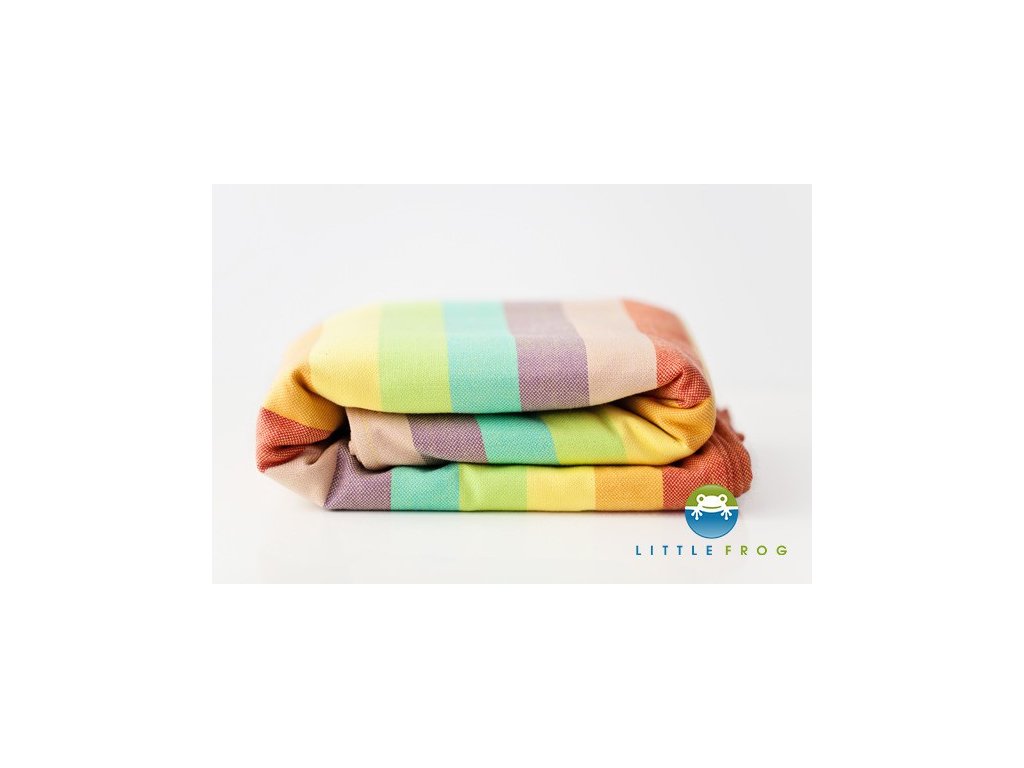 Little Frog je spíše tenčí šátek, tkaný lomenou keprovou vazbou, příjemně nosný, poddajný a měkký. Gramáž šátku zaručuje příjemný uzel v úvazu a nosnost i pro těžší děti ve vrstvených úvazech.