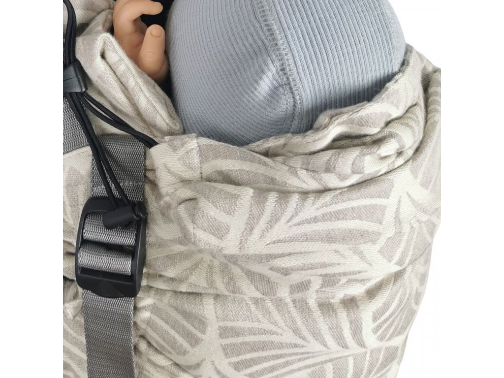 V horní části nosítka, mezi ramenními popruhy, můžete pomocí pevné gumky se stahovací brzdičkou zúžit šířku zádové opěrky a nosítko tak bezpečně obepne i velmi drobné miminko.