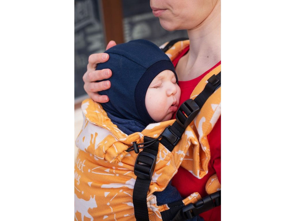Kapucka má obdélníkový tvar a v lemech všitou gumičku se stahovací brzdičkou. Díky tomu lze kapucku využít jak u velmi malých dětí, tak u batolat. Pokud kapucku zrovna nepoužíváte, můžete ji nechat volně spuštěnou přes zádovou opěrku, nebo ji poskládat do „tunelu“ a za gumičky ji zajistit o háček umístěný na ramenním popruhu. Založení kapucky můžete využít u menších dětí, které ještě dobře nedrží hlavičku, k vytvoření podpůrného límce. Límec můžete „vyztužit“ například zamotáním menší pleny, poskládané na čtverec.