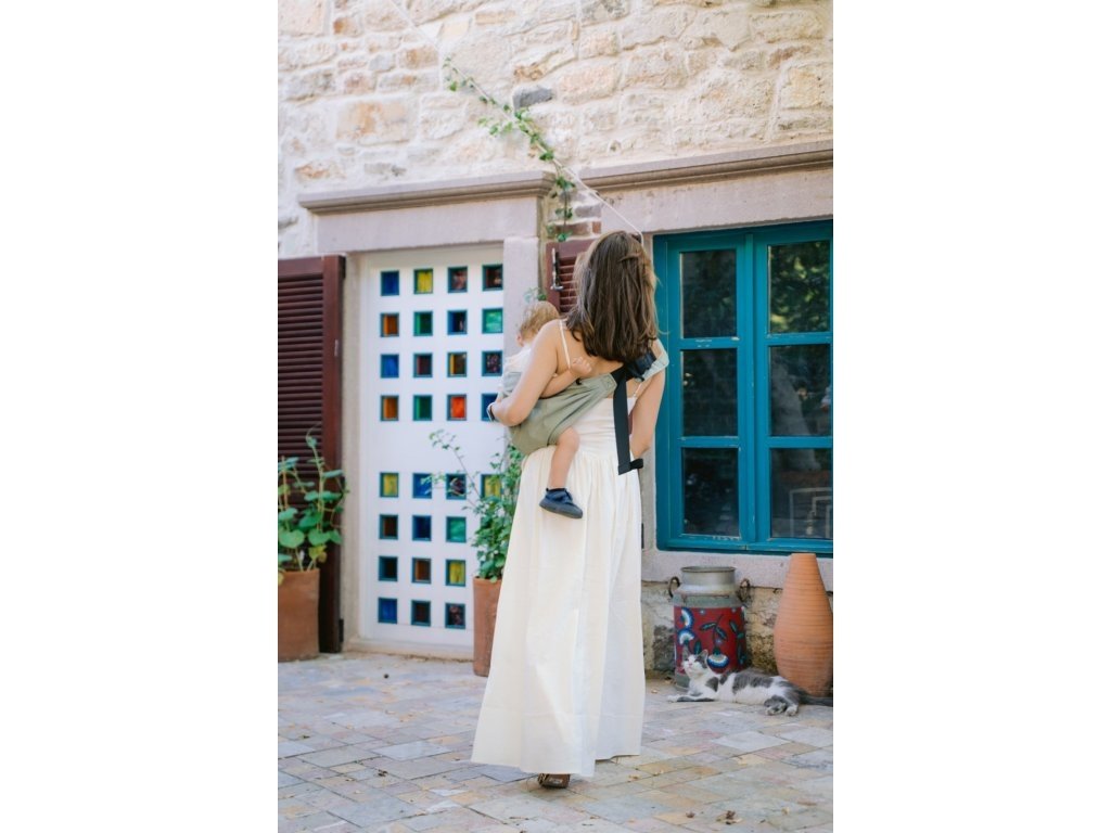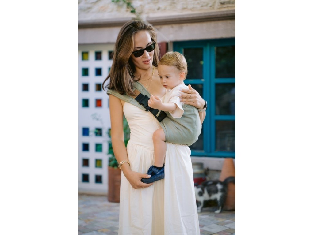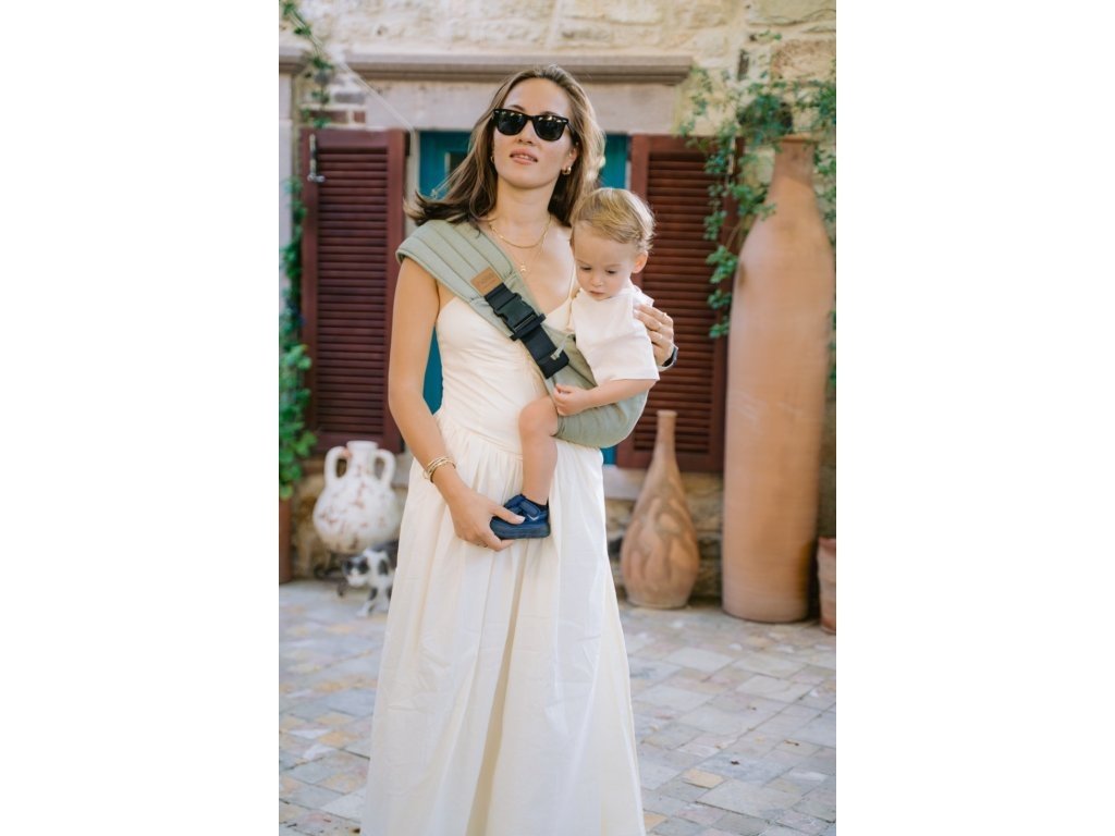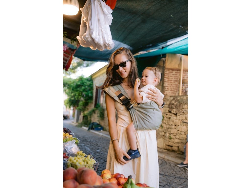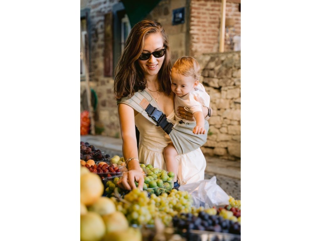 Nosítko je ušité z jemné organické biobavlny s certifikací GOTS – takže je šetrné k citlivé pokožce a krásně prodyšné. Nasazení? Jednoduchost sama. Žádné složité skládání nebo vázání – prostě nacvaknout přezky a můžete vyrazit.