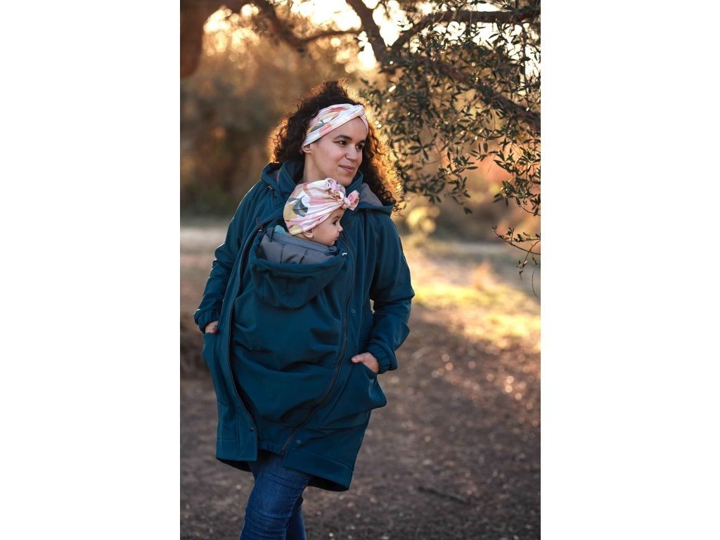 SOFTSHELL parka 5v1 je multifunkční bunda se dvěma výměnnými vsadkami. První vsadka ve tvaru "slzy" se používá ke zvětšení bundy v těhotenství, aby poskytla více prostoru pro rostoucí bříško. Druhá vsadka slouží k ochraně batolete při procházce, k nošení vpředu i vzadu.