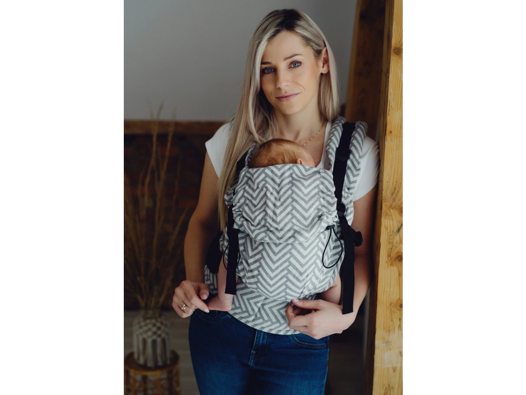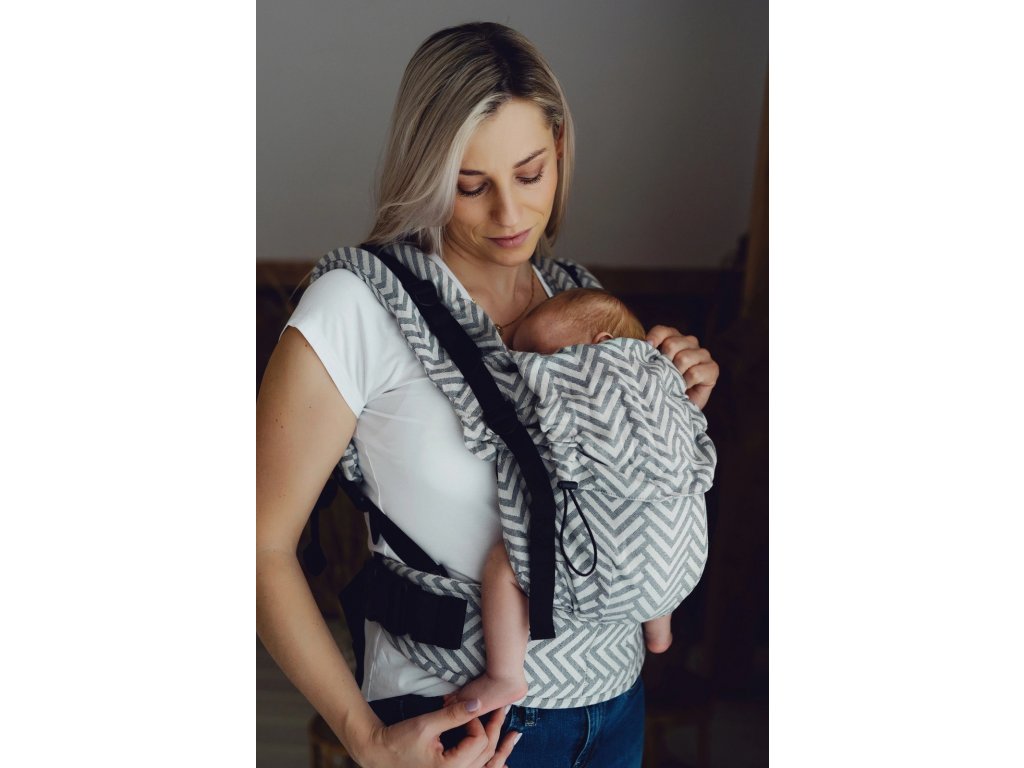 - Nosítko pro novorozence má odepínací kapuci, která je skvělá pro podepření hlavičky miminka při spánku. Připevňuje se na patentku, takže jej rychle zapnete / odepnete.
