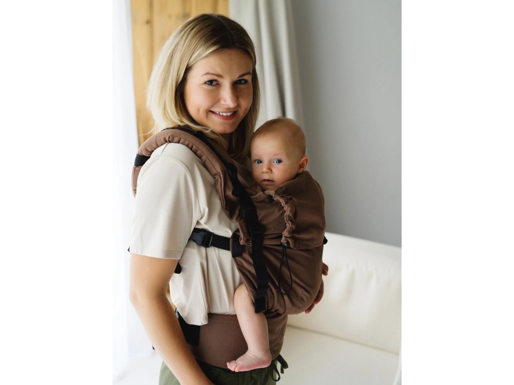Vše, co musíte udělat, je zapnout bederní pás, položit malého, nasunout panel, nasadit popruhy, vše utáhnout a... hotovo! Vaše ruce jsou volné a vaše dítě se k vám bezpečně přitulí.