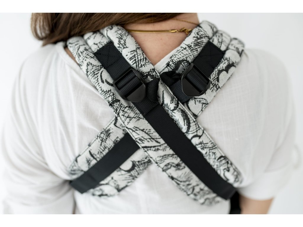 Ramenní popruhy jsou příjemně polstrované, určené ke křížení, ale je možné nosit je i klasicky K nastavení jsou zde umístěny nastavovací popruhy a jemné magnety, aby látka držela na správném místě, když dítě nosíme na zádech.