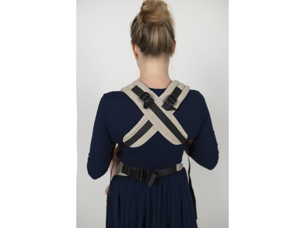 Ramenní popruhy jsou příjemně polstrované, určené ke křížení, ale je možné nosit je i klasicky K nastavení jsou zde umístěny nastavovací popruhy a jemné magnety, aby látka držela na správném místě, když dítě nosíme na zádech.