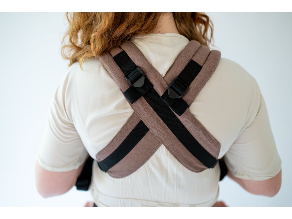 Ramenní popruhy jsou příjemně polstrované, určené ke křížení, ale je možné nosit je i klasicky K nastavení jsou zde umístěny nastavovací popruhy a jemné magnety, aby látka držela na správném místě, když dítě nosíme na zádech.