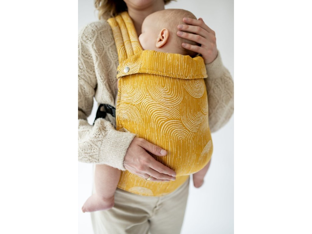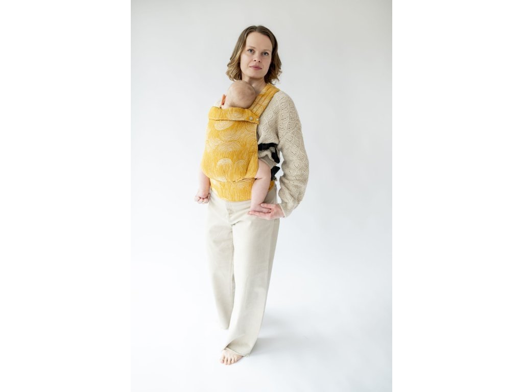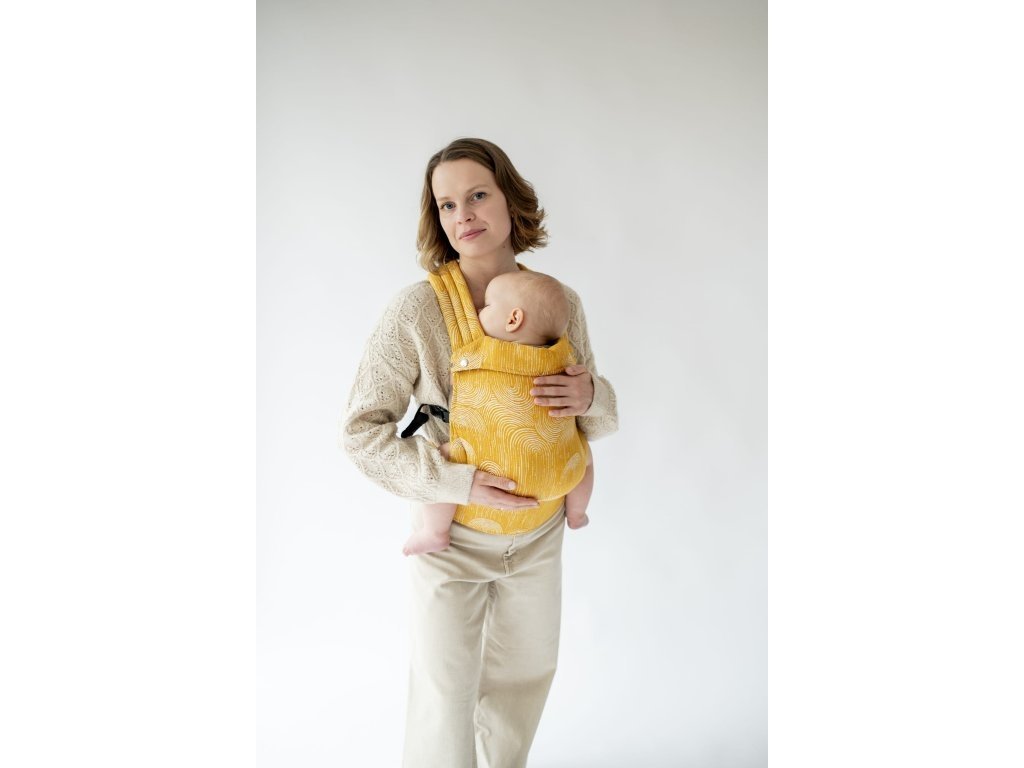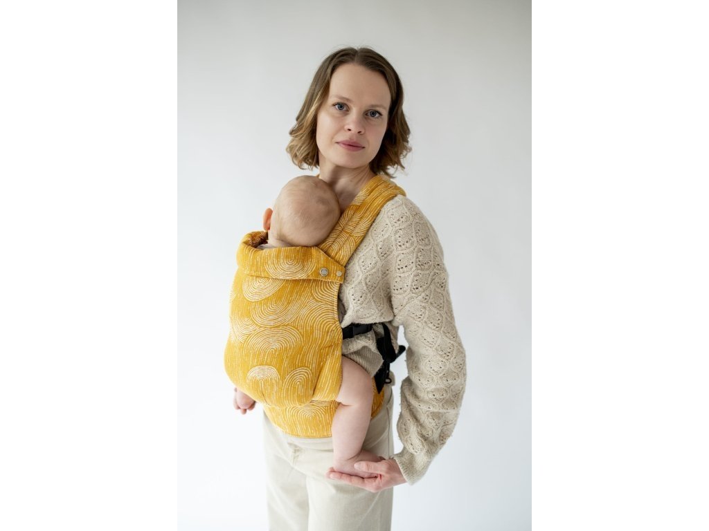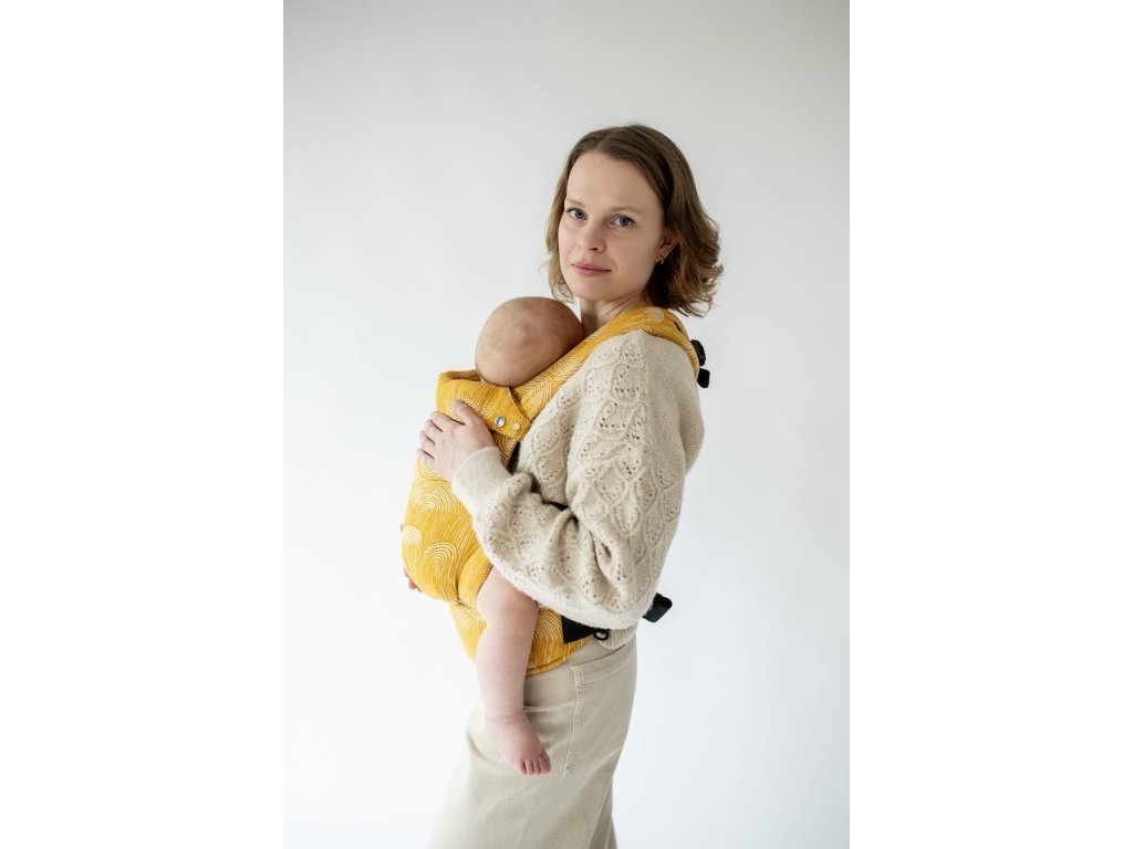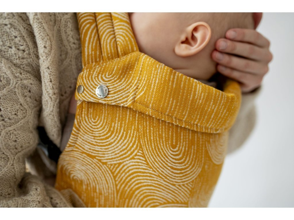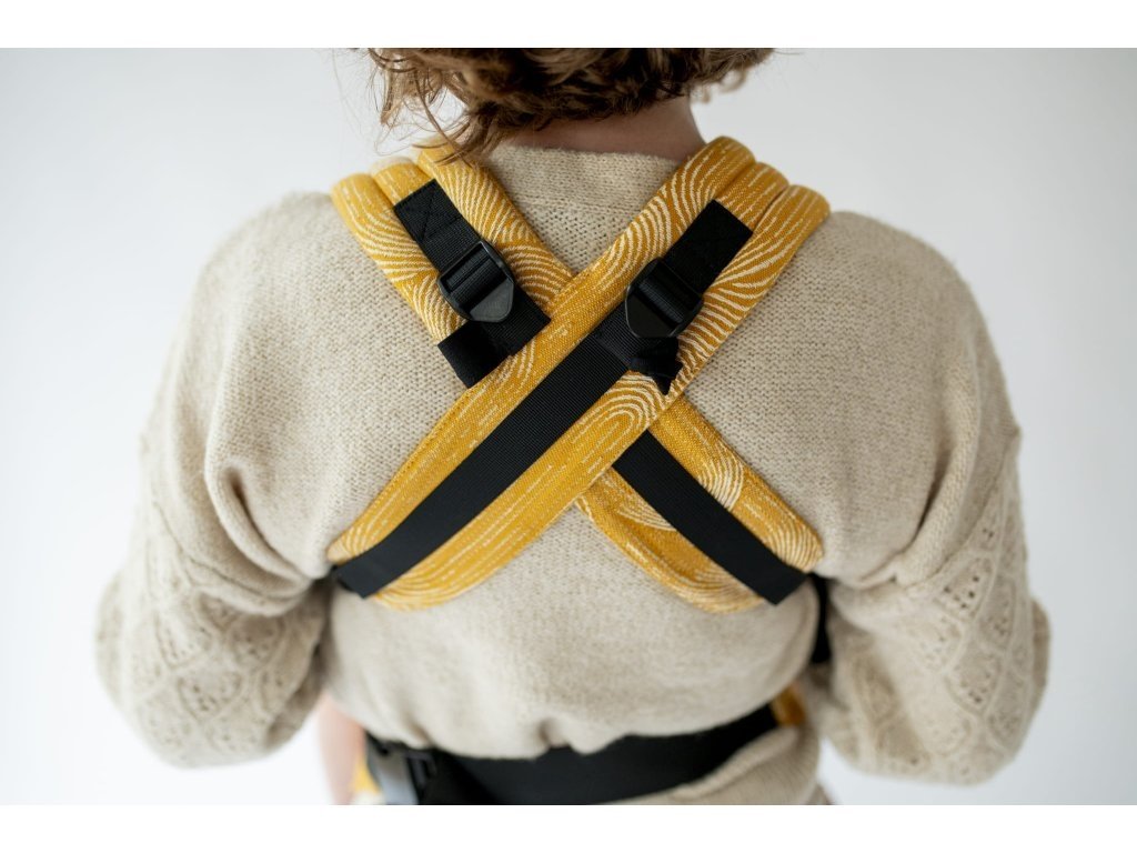 Ramenní popruhy jsou příjemně polstrované, určené ke křížení, ale je možné nosit je i klasicky K nastavení jsou zde umístěny nastavovací popruhy a jemné magnety, aby látka držela na správném místě, když dítě nosíme na zádech.